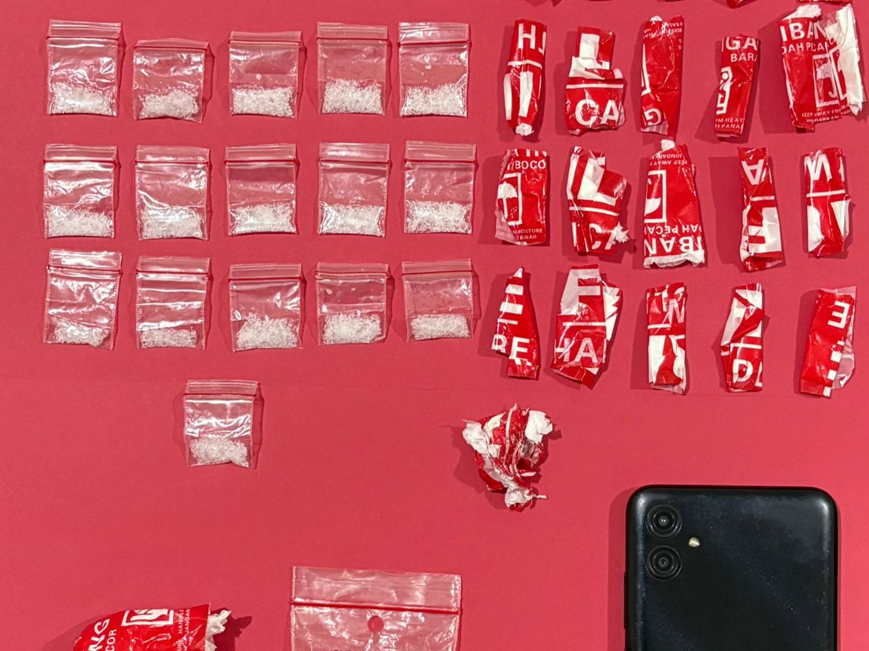 Dari hasil penggeledahan di lokasi, ditemukan 21 bungkus plastik klip berisi serbuk kristal sabu yang dibungkus tisu dan dilakban merah.
