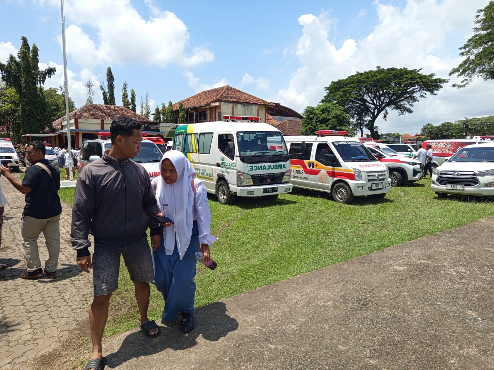 Belasan ambulan disiagakan untuk mengevakuasi ratusan siswa SMA 2 Kudus diduga keracunan massal. --