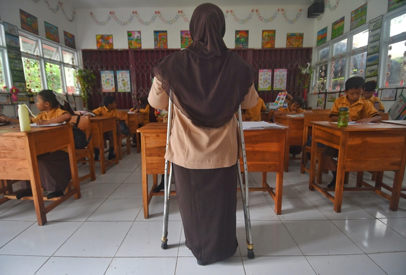 Inspiratif! Guru di Grobogan Ini Semangat Mengajar Meskipun Berdiri dengan Dua Tongkat