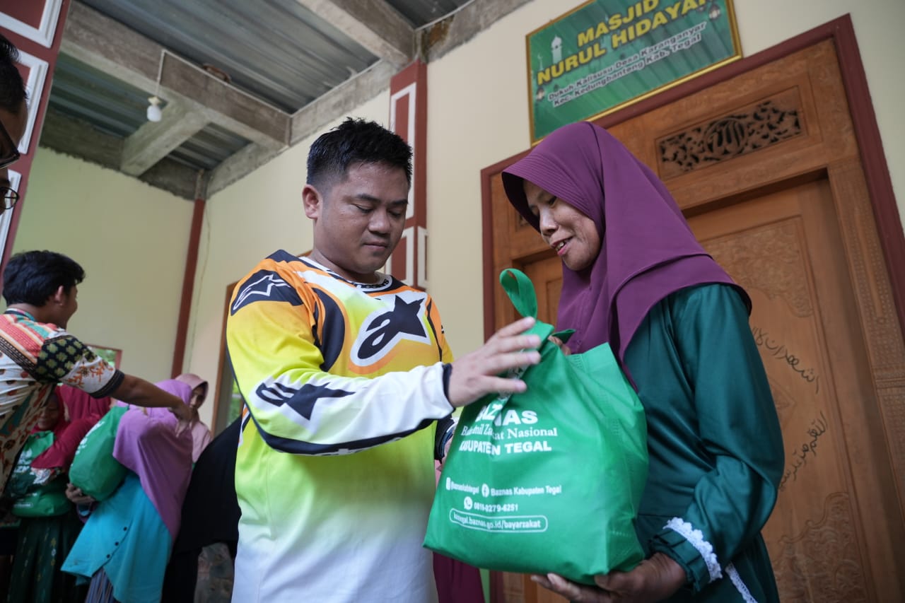 Di lokasi tujuan, ratusan warga telah menanti. Sebanyak 100 warga dari keluarga kurang mampu menerima paket bantuan sosial berupa uang tunai dan sembako dari Baznas Kabupaten Tegal.