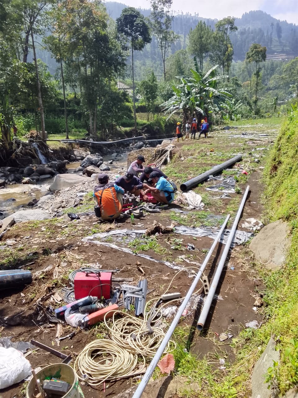 Sementara perbaikan juga dilakukan di Desa Dukuhbenda Kecamatan Bumijawa dengan proses pembuatan tiang penyangga dan pengelasan pipa.