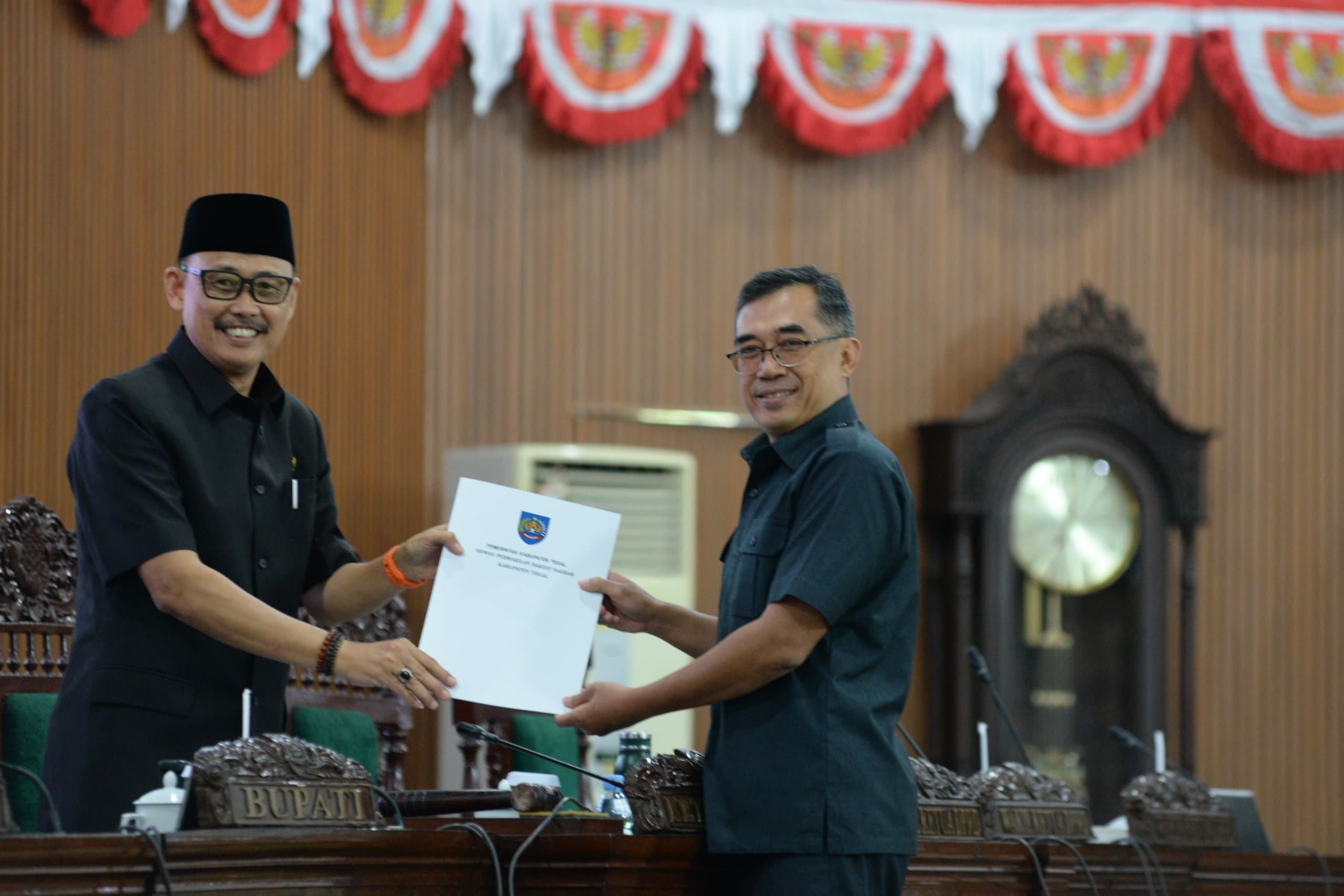 Sekretaris Fraksi Golkar, M. Alfian Adipradana, menyerahkan Pandangan Umum Fraksi kepada Pimpinan DPRD Kabupaten Tegal, Sugono, Rabu (18/2/2026).--