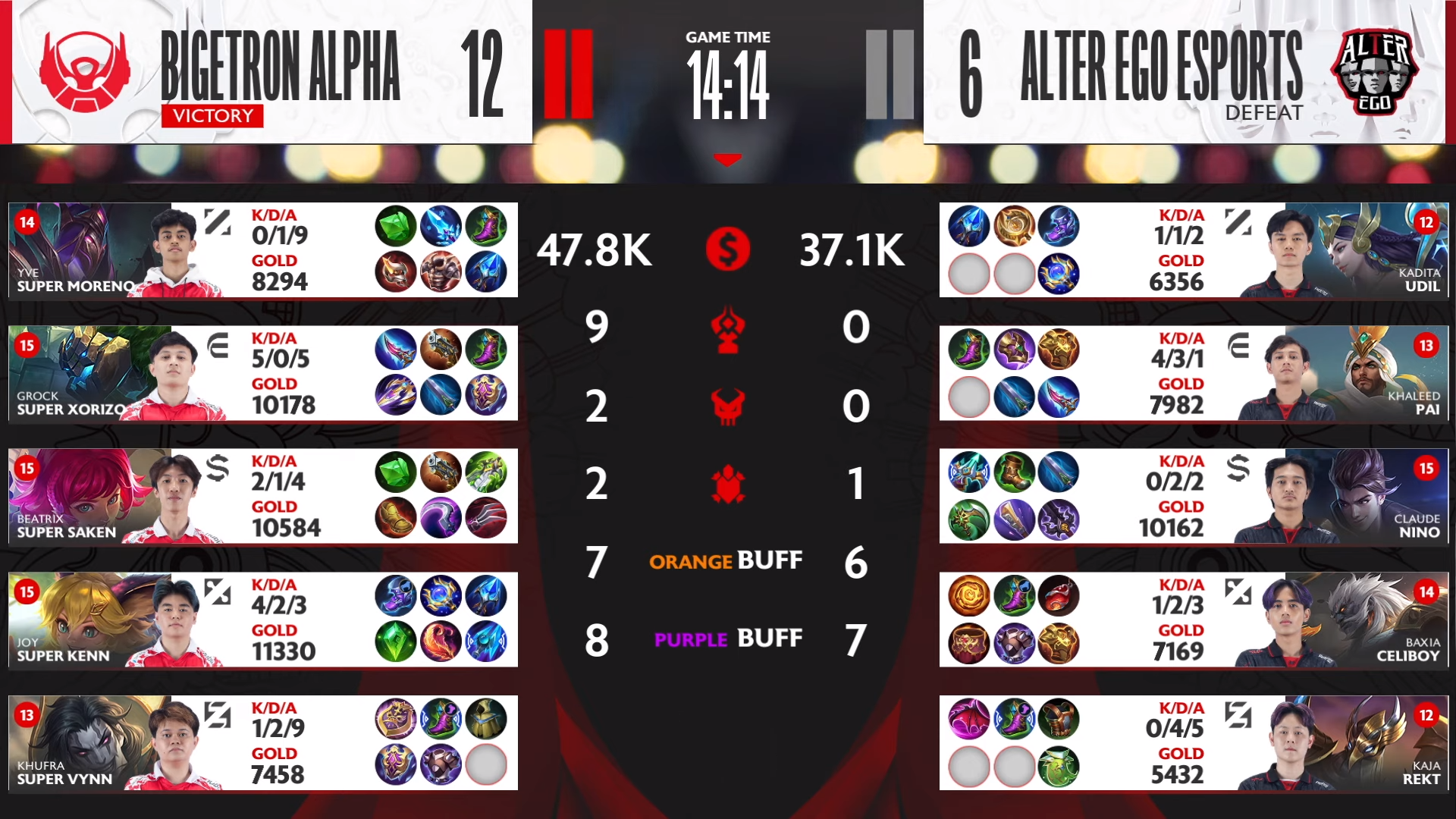 Kembali bersabar, Bigetron Alpha lebih memilih mengamankan objektif terlebih dahulu dan berhasil mendapatkan lord kedua di menit ke-13. Berbekal lord kedua yang lebih kuat, Bigetron Alpha kali ini langsung melakukan inisiasi serangan di arah bawah pertahanan Alter Ego Esports.