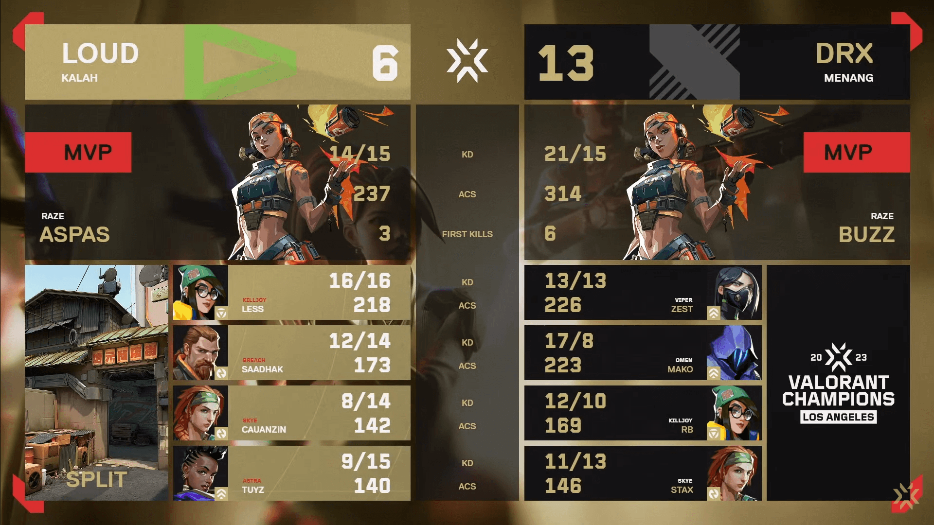 Pertarungan sengit kedua tim terjadi di babak overtime, hingga akhirnya LOUD mampu menutup match pertama di ronde ke-28 dengan skor 13-15. Hasil ini membuat LOUD sementara unggul 0-1 atas DRX.