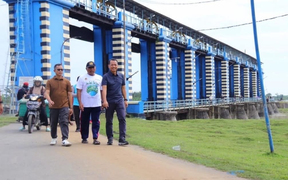 Bupati Samani, Dinas PUPR dan BPBD memantau Bendung Wilalung.-arief pramono/diswayjateng.id-