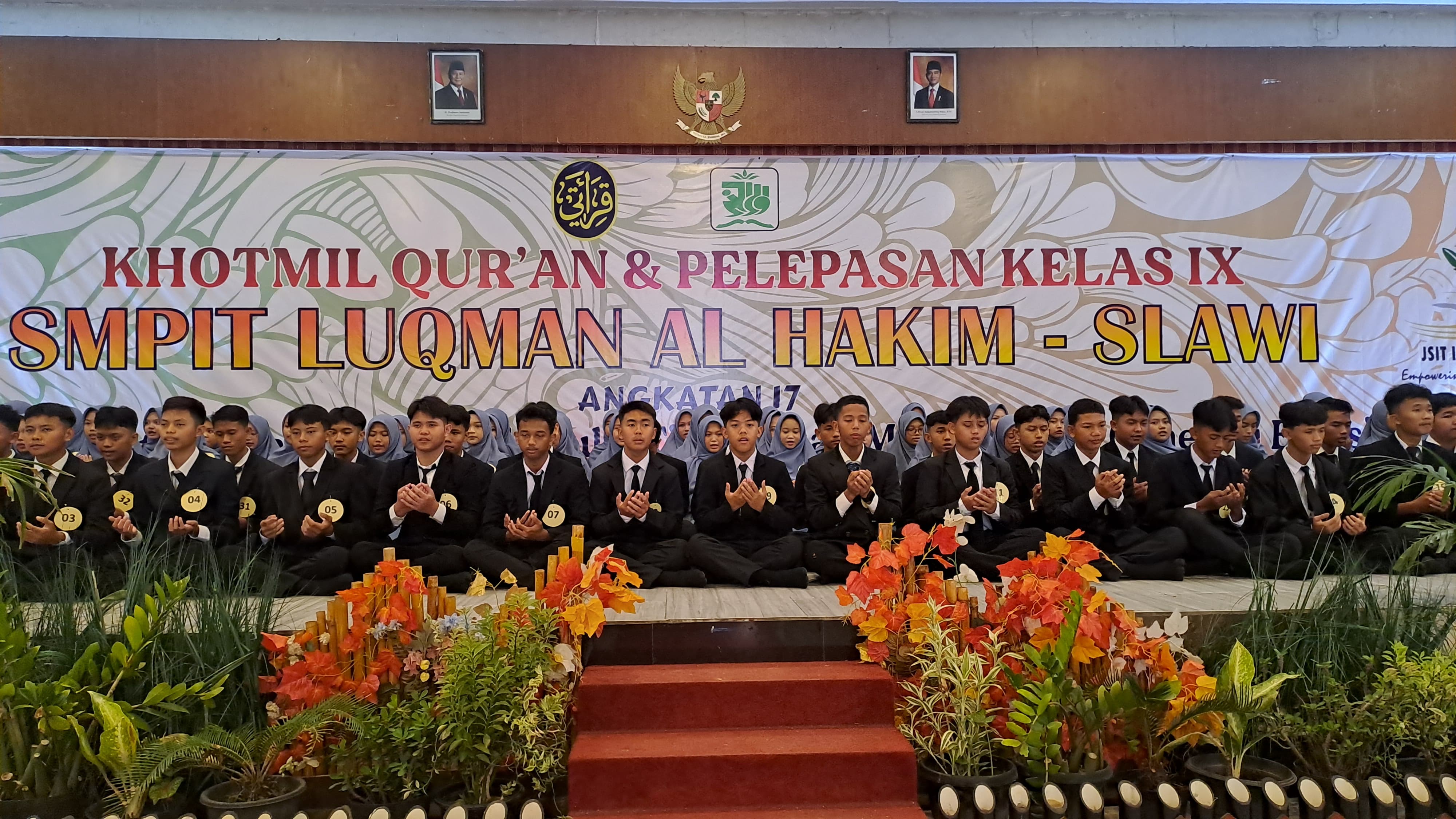 SLAWI, diswayjatwng.id - SMP IT Luqman Al Hakim Slawi mengadakan khotmil Quran dan pelepasan kelas IX angkatan 17 dengan tema 'Membentuk Adab dan Akhlak Mulia Tiada Batas, Menyongsong Generasi Emas'. Kegiatan dilaksanakan di gedung pertemuan salah satu hotel di Slawi. Dua agenda inti pada acara ini adalah acara khotmil Quran dan elepasan. Prosesi khotmil Quran dan Imtihan dipimpin oleh Ustadah Sholaha Khansa SPd.