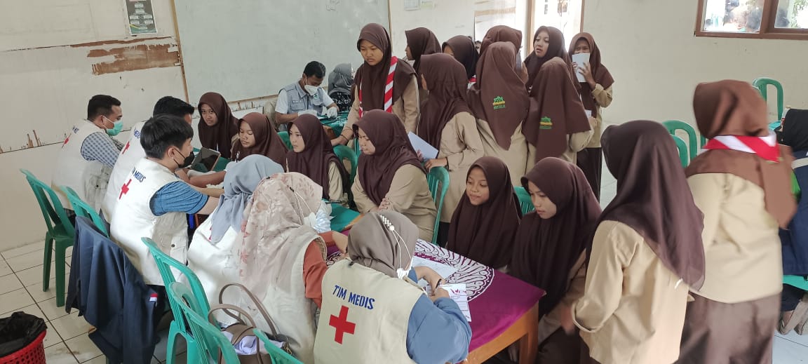 Para santri dan wali santri di Ponpes Nurul Hikmah Tuwel Kecamatan Bojong, Kabupaten Tegal mengikuti pelayanan medis gratis, Sabtu (23/9).-Yeri Noveli-jateng.disway.id