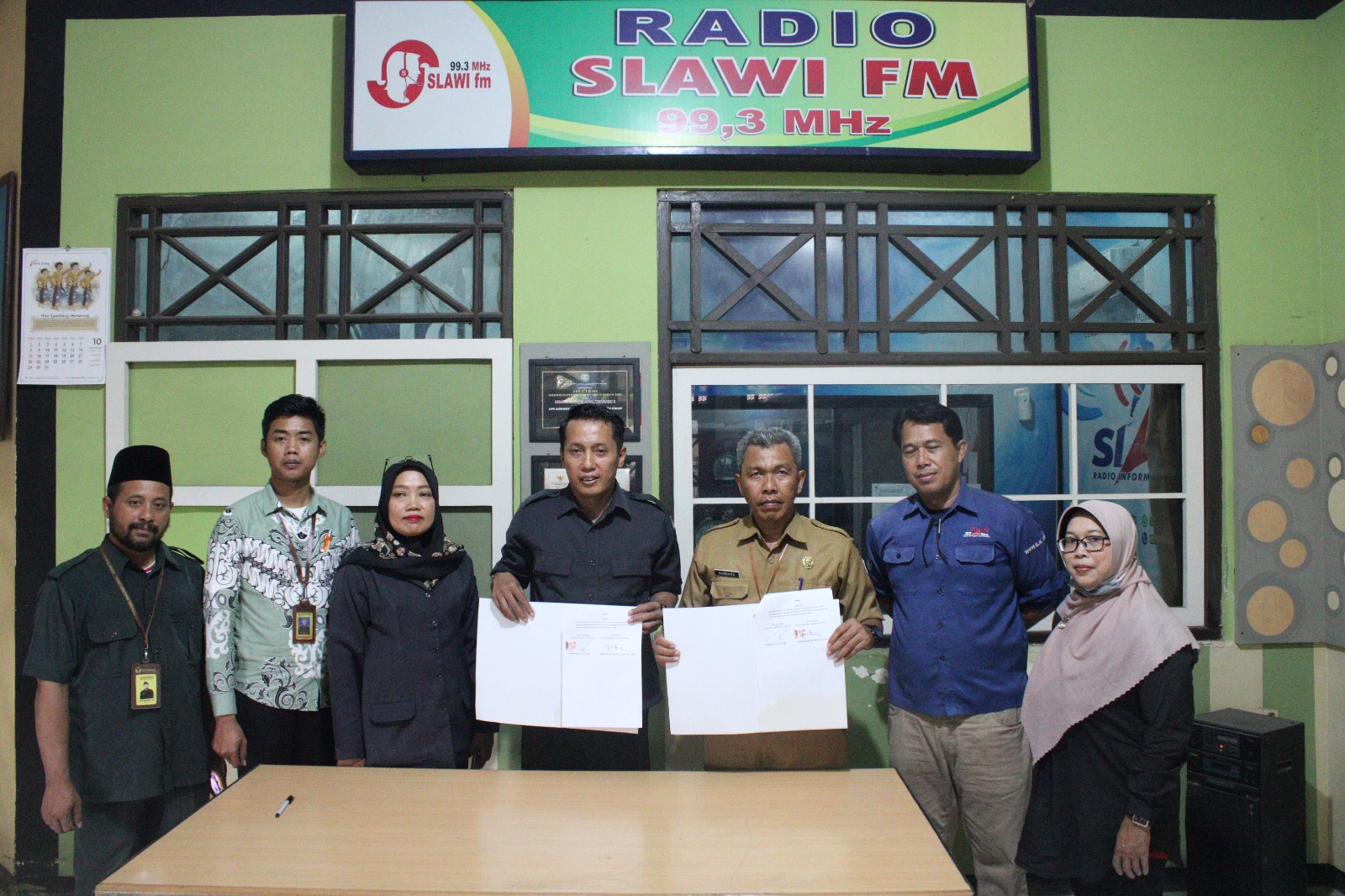 Dirut LPPL Slawi FM Kabupaten Tegal Kusnianto dan Ketua Bawaslu Kabupaten Tegal Harpendi Dwi Pratiwi bersama jajarannya menunjukkan dokumen MoU yang sudah ditandatangani.-Yeri Noveli-jateng.disway.id